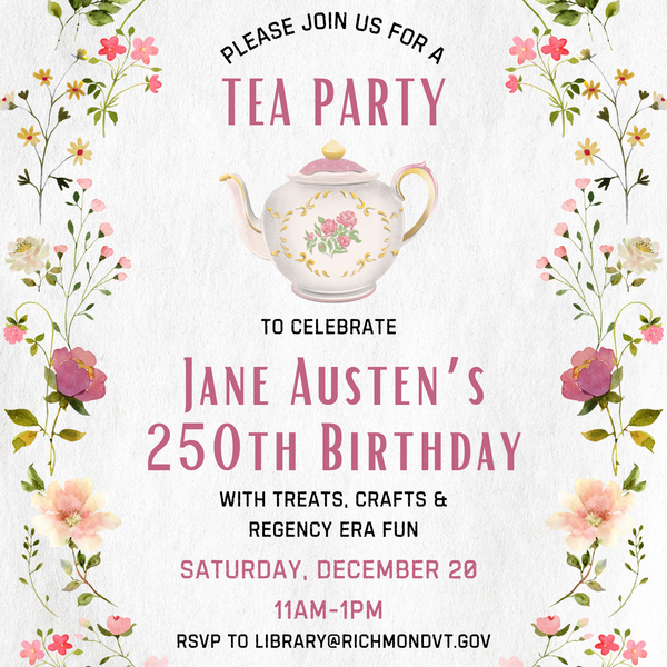 Join us for tea, treats, crafts, and more Regency era fun on Saturday, December 20, from 11 am – 1 pm, to celebrate Jane Austen’s 250th birthday. RSVP to library@richmondvt.gov or (802) 434-3036.
