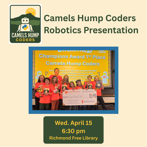 Camels Hump Coders, a local group of 4th to 7th grade students, will be giving a presentation about their award-winning robotics project. These students have taken first place in the state First Lego League competition and…