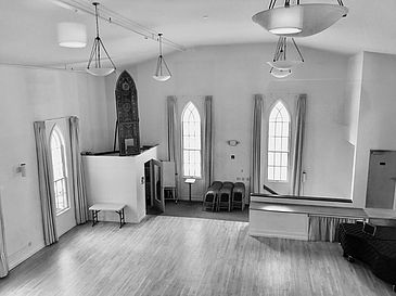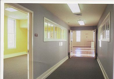 Two thirds of the former sanctuary on the second floor was renovated to become a meeting room. Soon after a grand piano was donated to the library for concerts in this space. An open mezzanine was added to the top level to provide a small meeting space with four study/music rooms. Later it was enclosed for sound abatement. A hallway connected the stairs and Community Room with two youth library rooms on either side.