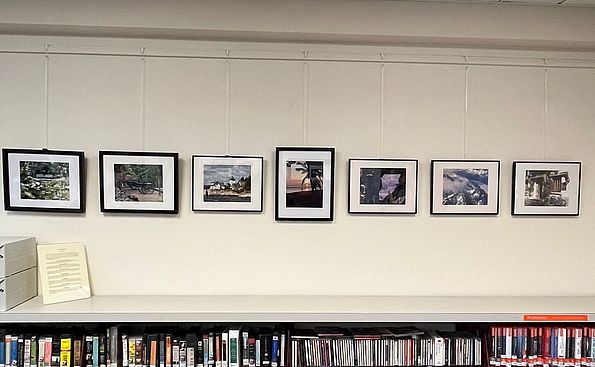 We offer wall space to local artists who might be interested in showing their work for up to two months. Both professional artists and those who pursue art or photography as a hobby are encouraged to show their work. The walls above our first floor lounge area are equipped with moldings and a zippered-hook cord system for easy hanging of up to 8 pieces. Additional display space is available over the bookshelves. The glass display space in our foyer is available for showcasing smaller 3D artwork and interesting collections. Art shows are promoted via our social media channels. Contact the library to make arrangements to show your work.