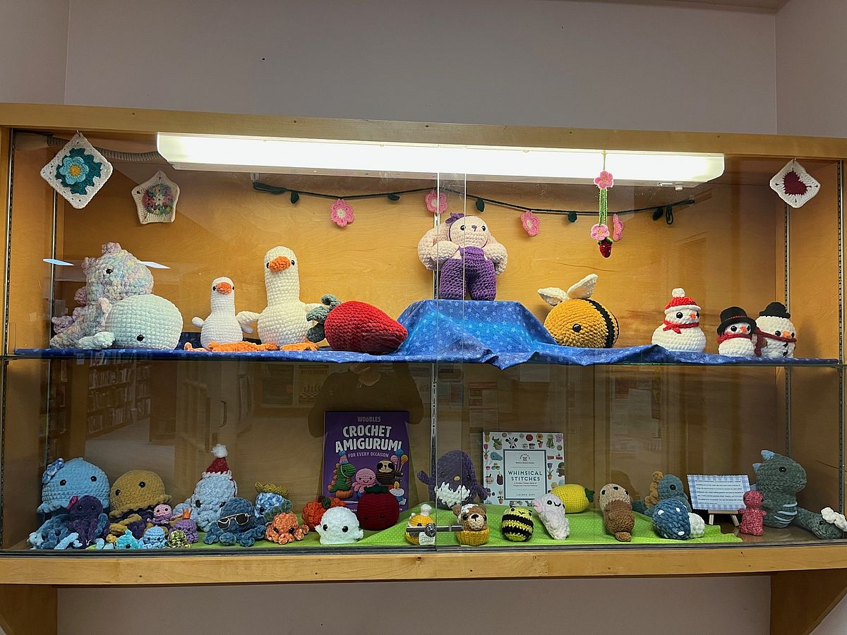 In September and October we are featuring the crocheted amigurumi creations of Ophelia Paine. Ophelia is a sophomore at MMU. She started crocheting around two years ago and has made a variety of things. Her favorite thing to crochet is a plushie toy, also called amigurumi, but she enjoys making garlands and granny squares as well. She mainly use the websites Ribblr, Ravelry, and YouTube to find patterns for her projects. You can find books with amigurumi patterns at the library too!