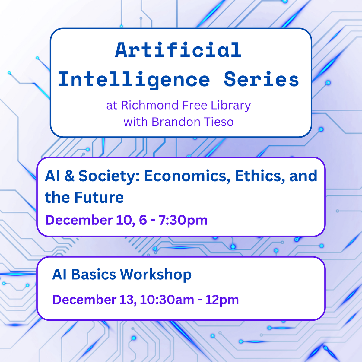 Join us for a two-part series on Artificial Intelligence (AI). Brandon Tieso will present about AI & Society, followed a few days later by a hands-on demonstration and discussion of several AI tools.