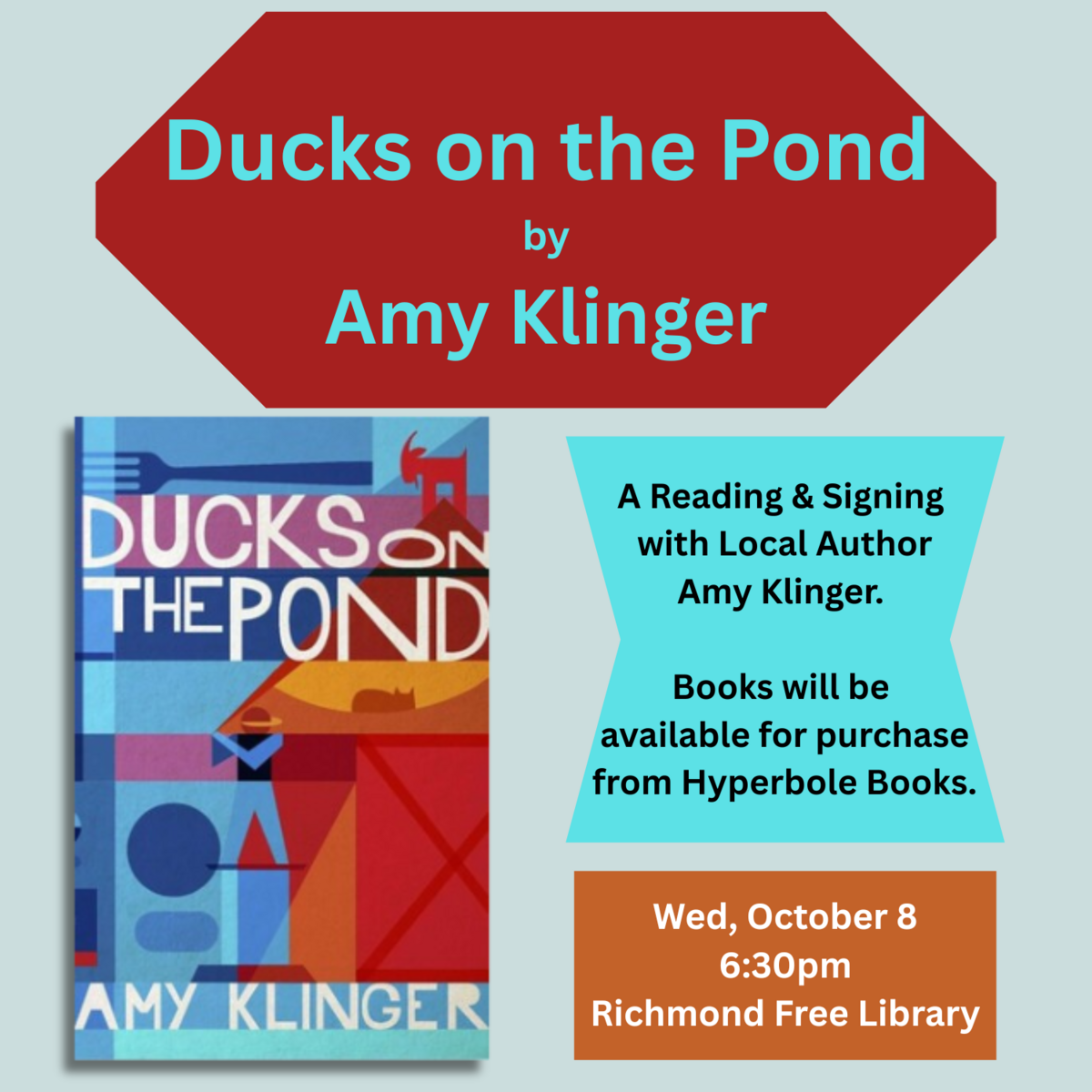 Help us celebrate local author Amy Klinger’s new book, Ducks on the Pond, with a reading and signing on Wednesday, October 8, from 6:30 - 7:30 pm. Hyperbole Books will be at the event to sell copies.