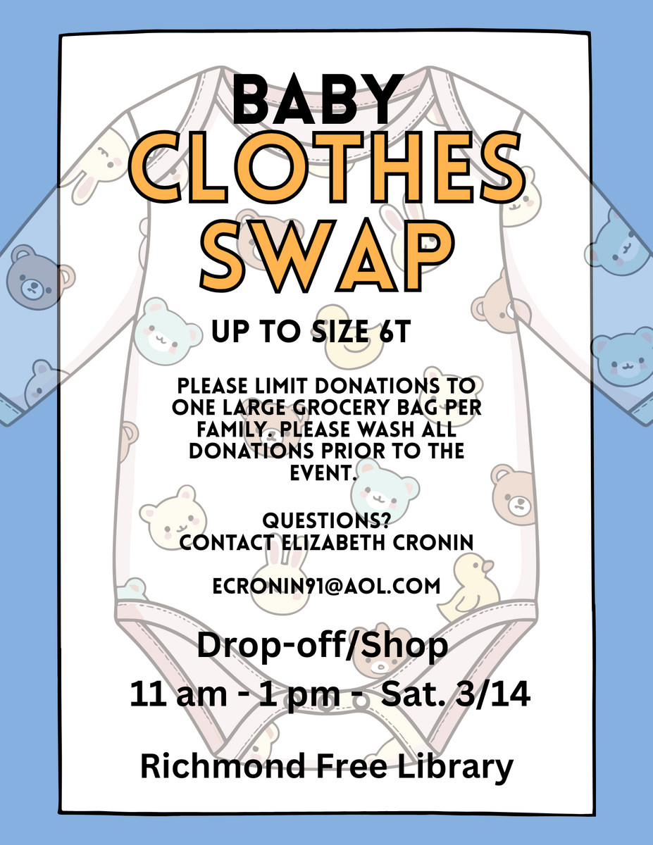 Have you starting shopping for spring clothes for your baby/toddler yet? Have old baby clothes laying around? We are hosting a Children’s Clothing Swap on Saturday March 14th from 11:00 am -1pm. Please limit donations to one large grocery bag per family, and make sure all donations are washed prior to the event. We are looking to cap the clothing sizes at 6T for this event. You do not need to donate clothes to attend the event.