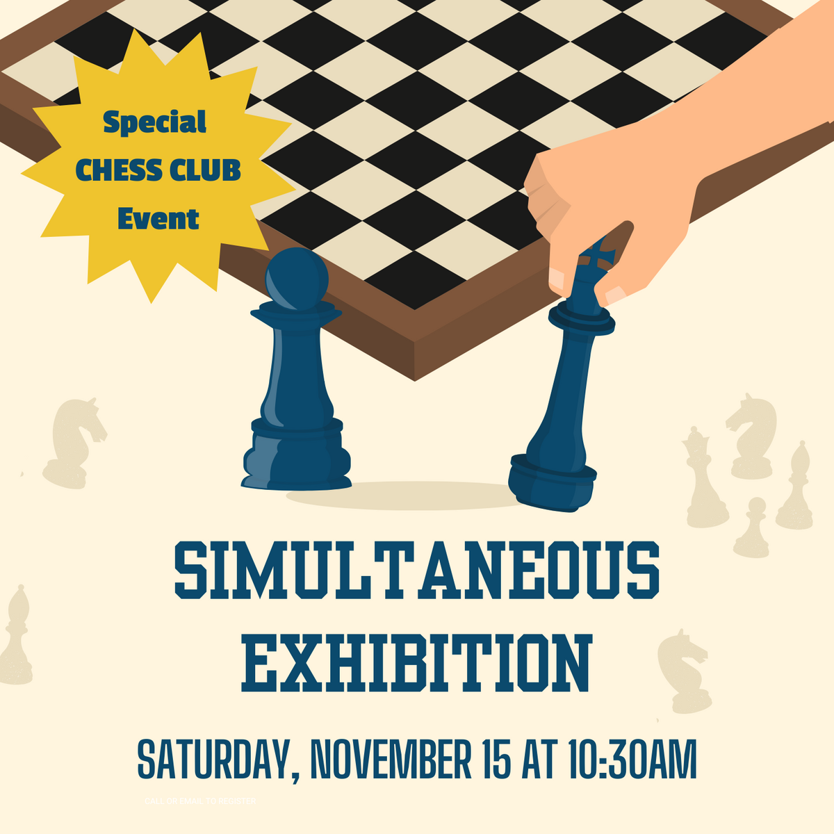 Think you can beat our chess coach? We've got a special Chess Club event coming up! On Saturday, November 15, at 10:30 am, our chess coach, Andre Gorostiaga, will be holding our second simultaneous exhibition, where he'll play a group of challengers at the same time, in the round. Want to play? Call or email the library to register: (802) 434-3036 or library@richmondvt.gov. Open to all ages. Plan to bring your own chessboard.