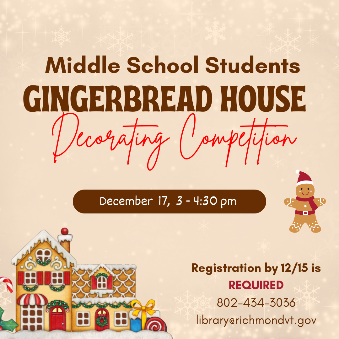 For middle school students only. Join us December 17, from 3-4:30 pm, for a gingerbread house decorating competition! We’ll provide everything you need to create your gingerbread (graham cracker) masterpiece, then compete for prizes. Snacks will be provided! Registration is required by December 15. Call or email the library at (802) 434-3036 or library@richmondvt.gov.