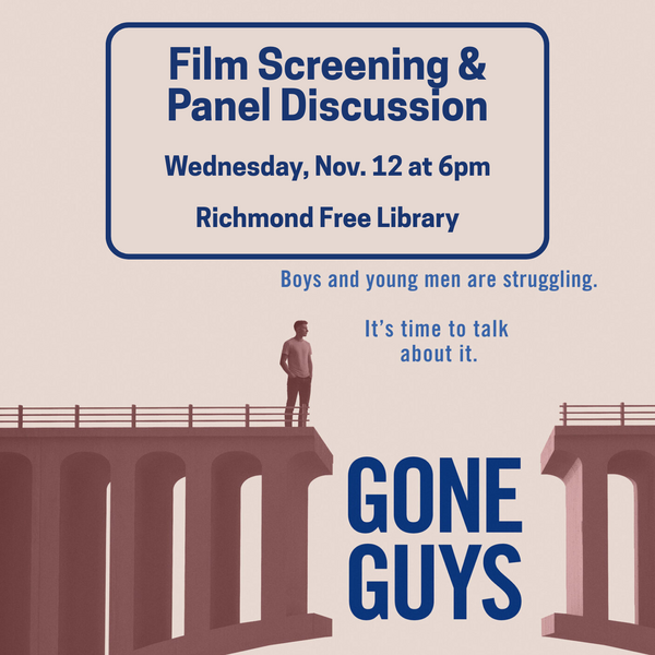 Join us on Wednesday, November 12, at 6 pm for a screening of Gone Guys, a locally made documentary examining the challenges facing boys and young men in Vermont and beyond. Following the film, we’ll have a panel discussion featuring MMUUSD Superintendent of Schools John Muldoon, a local child & family mental health professional, and a local teen. Co-sponsored by Richmond Free Library and All Together Now.