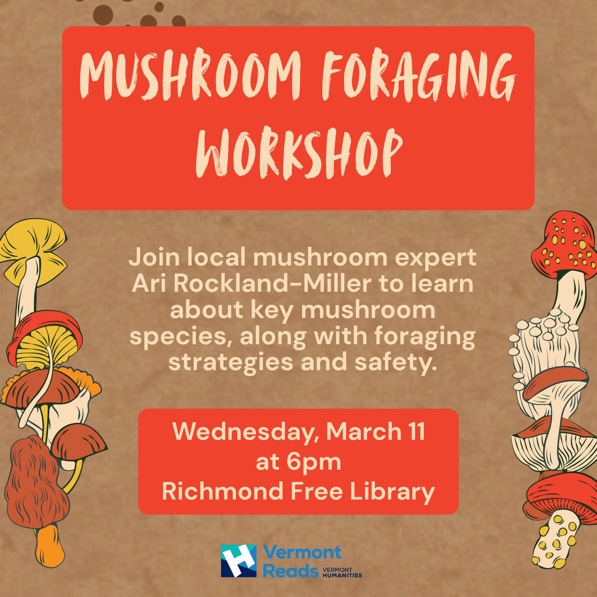 Join local mushroom expert Ari Rockland-Miller to learn about key mushroom species, along with foraging strategies and safety. Wednesday, March 11 at 6pm in the Richmond Free Library Community Room.