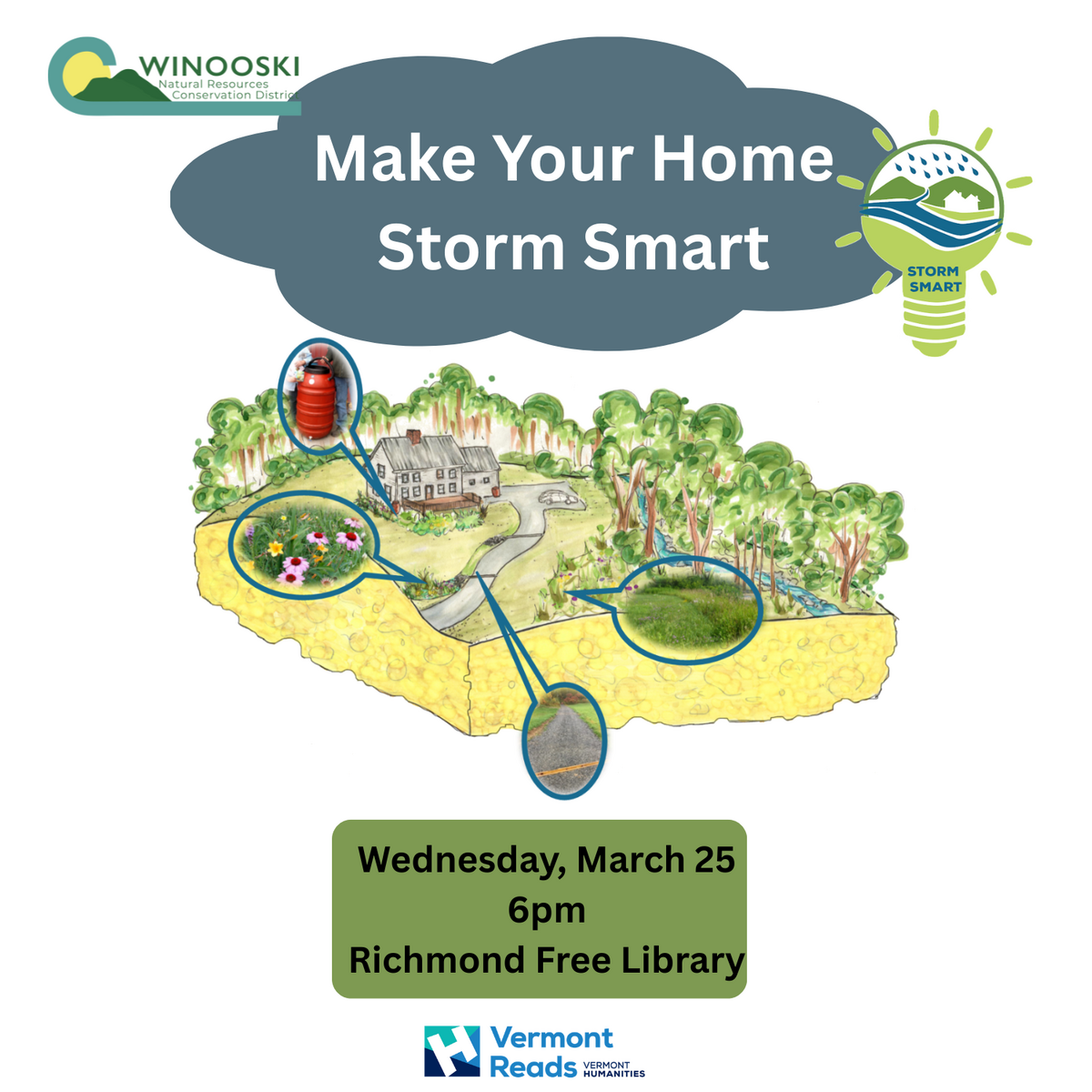On Wednesday, March 25, at 6pm, staff from Winooski NRCD will come teach strategies to make our homes Storm Smart. Storm Smart homes use “green stormwater infrastructure” solutions like rain gardens, rain barrels, and water bars to slow down, spread out, and sink in rainfall, helping to protect our homes, our neighbors, and our towns during heavy rainstorms.