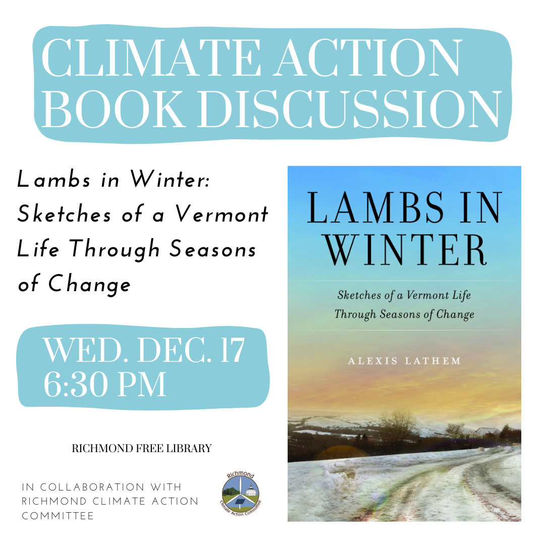 Join Richmond Climate Action to discuss Lambs in Winter: Sketches of a Vermont Life Through Seasons of Change by Richmond resident Alexis Lathem on Wednesday, Dec. 17 at 6:30 pm.