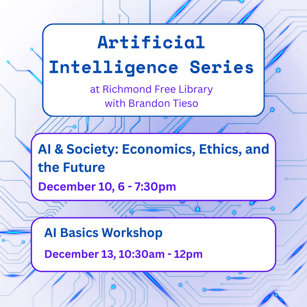Join us for a two-part series on Artificial Intelligence (AI). Brandon Tieso will present about AI & Society, followed a few days later by a hands-on demonstration and discussion of several AI tools. AI & Society -…