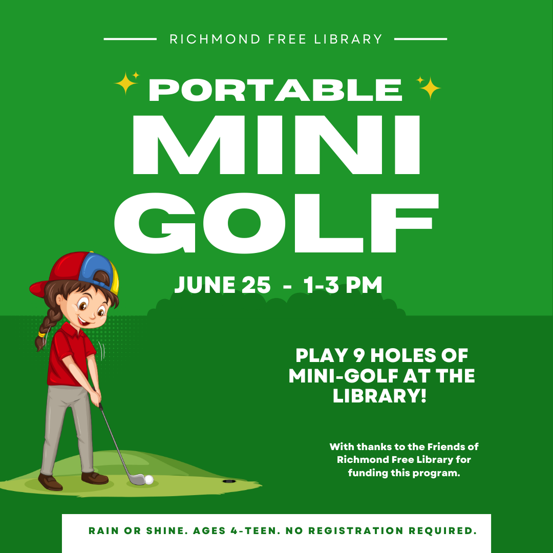 We will have a 9-hole mini golf course and everything else necessary for kids to enjoy a fun round of golf at the library. The event will take place rain or shine outdoors or indoors if wet. Drop by for your turn to test your skill on this fun course. No registration is required. Ages 4-teen.