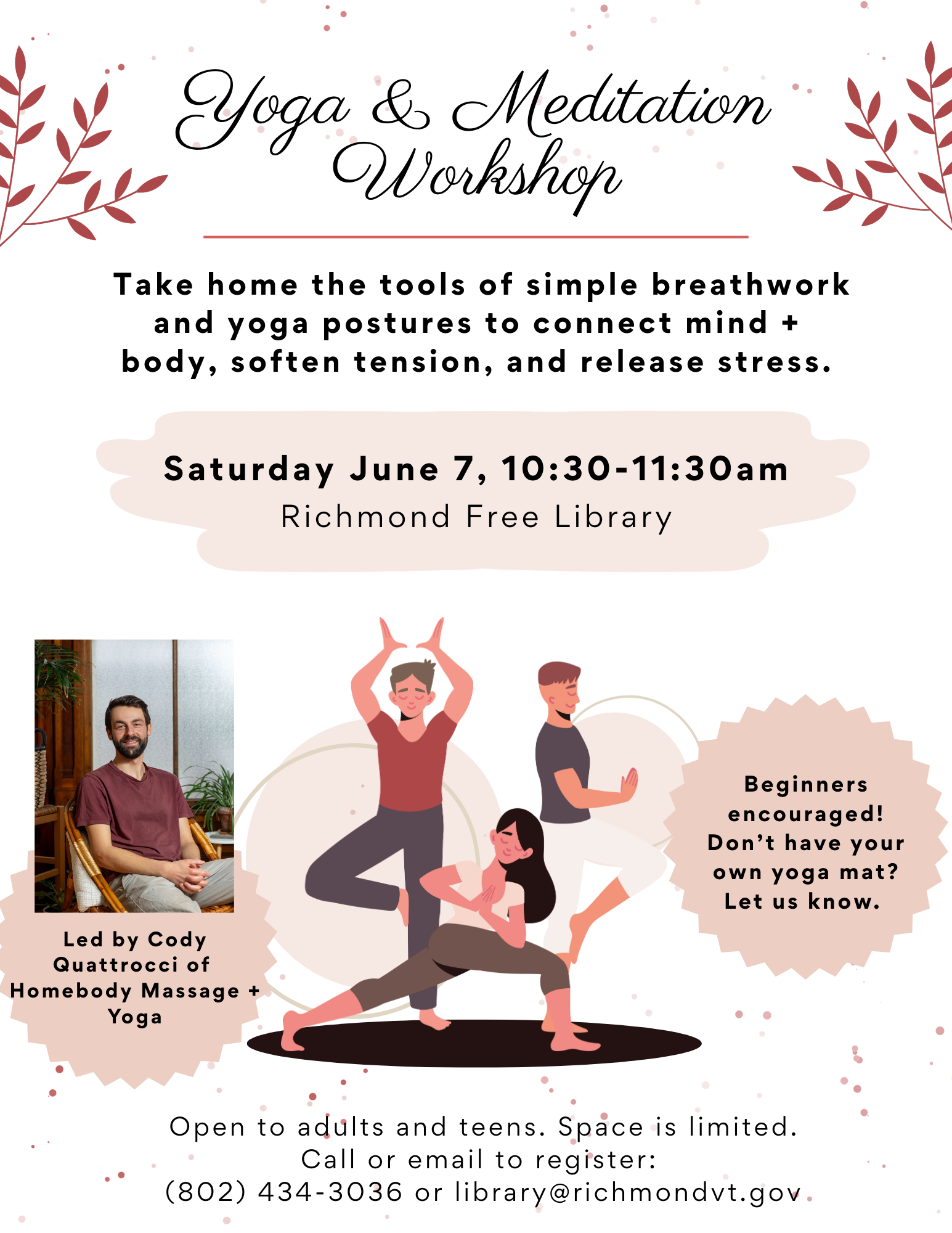 Enjoy a gentle session of restorative yoga and meditation with Cody Quattrocci of Homebody Massage + Yoga. Take home the tools of simple breathwork and yoga postures to connect mind and body, soften tension, and release stress. Beginners encouraged. Don’t have your own mat? Let us know. Space is limited. Call or email to register.